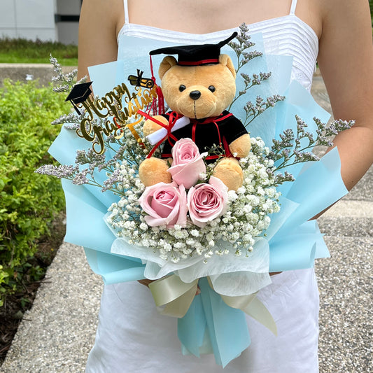 {G6}Triple roses and baby's breath with big graduation bear